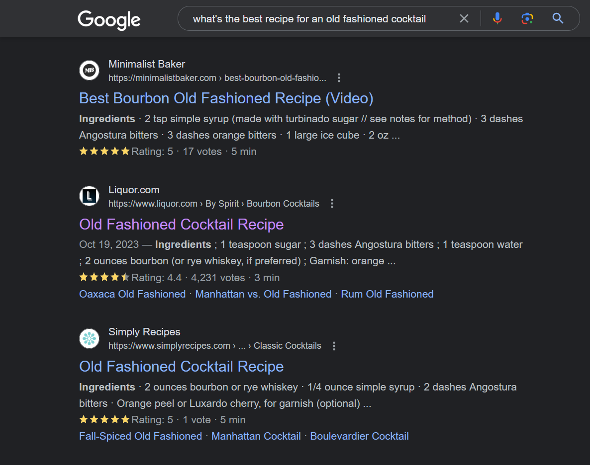 For example, if you just search the basic question “what’s the best recipe for an old fashioned cocktail,” you’ll get multiple good variations on the standard recipe in the regular results. (I excluded the recipe three-pack at the top, but it also has quality results.)