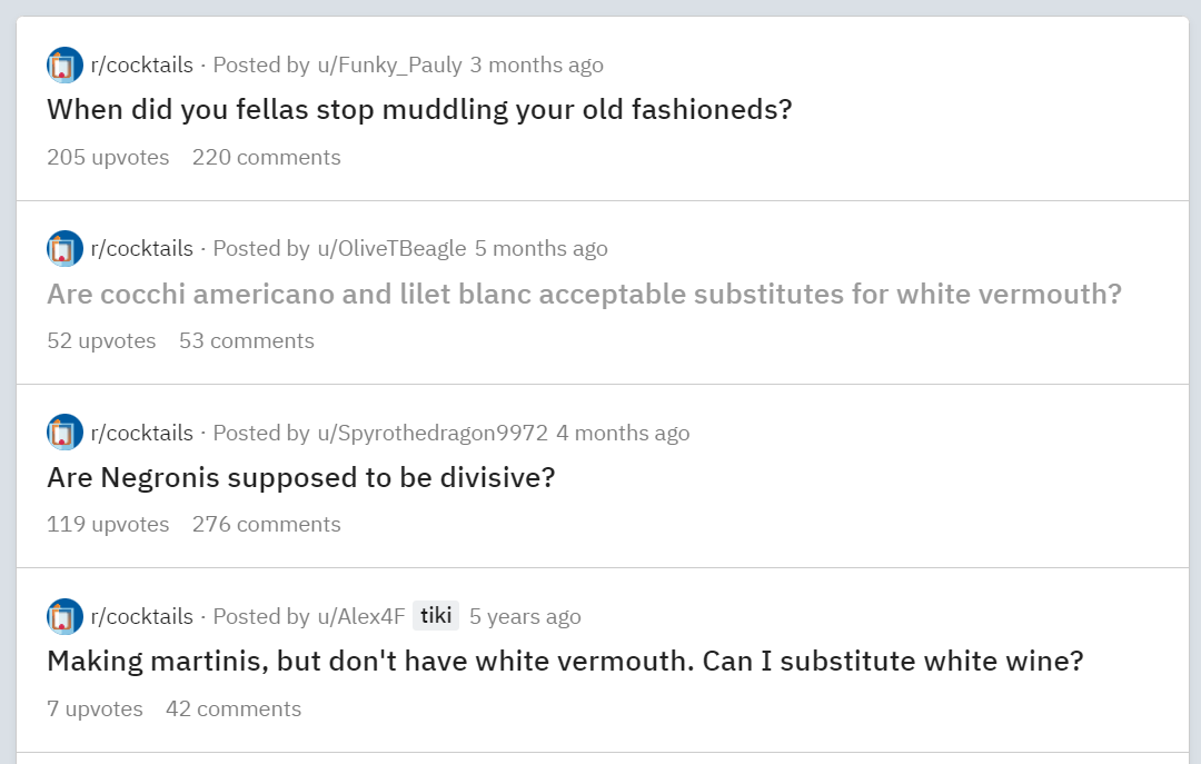 That’s why when I have questions like this, I don’t go to Google. I go to Reddit. Or I drop into the Educated Barfly Discord server. Or I talk to one of the U.S. Bartenders’ Guild people I know.