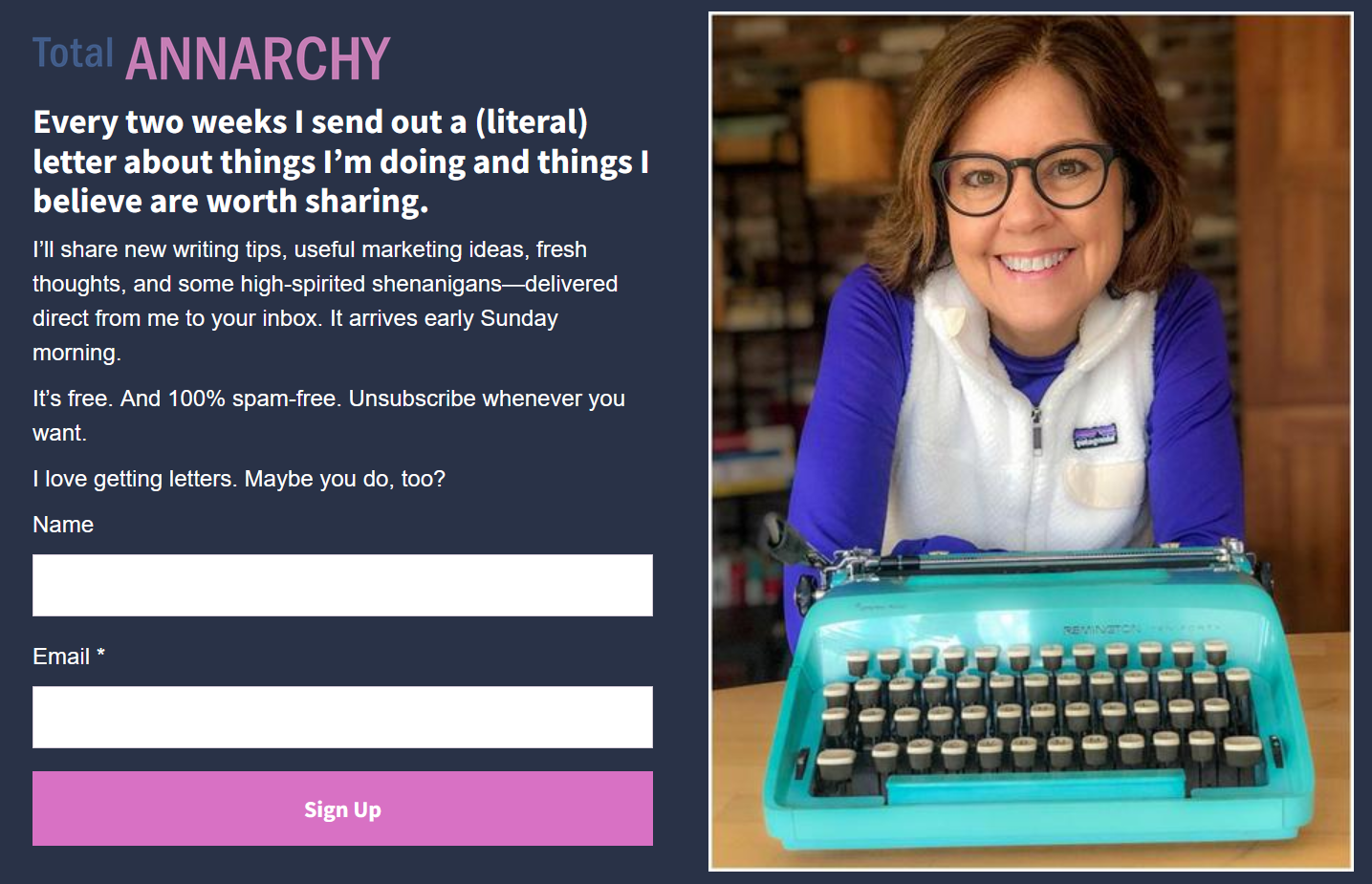 Proven expertise: If you’ve been in a particular field for a long time, your name may carry enough weight that people will share their information just based on the strength of your reputation. Marketer Ann Handley doesn’t have to belabor who she is to her readers … her newsletter appeal is simple.
