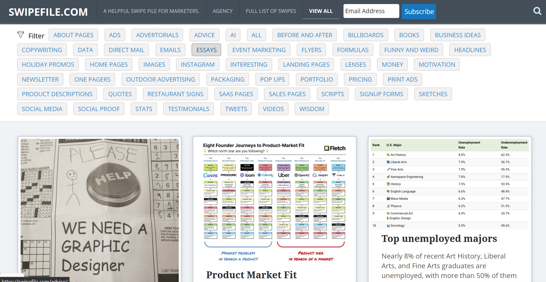 Pure value: Most tools fall under this category. If the tool is useful, it doesn’t matter who’s plugging it — the lead magnet will work. Even the idea of a good tool may be enough (Joel Gascoigne’s lead magnet for Buffer famously predated the product’s existence). One of my favorite resources, SwipeFile.com, lets you access everything without putting in your email address, but if you want updates as new inspirations are added you have to subscribe. There’s enough value there to generate registrations.