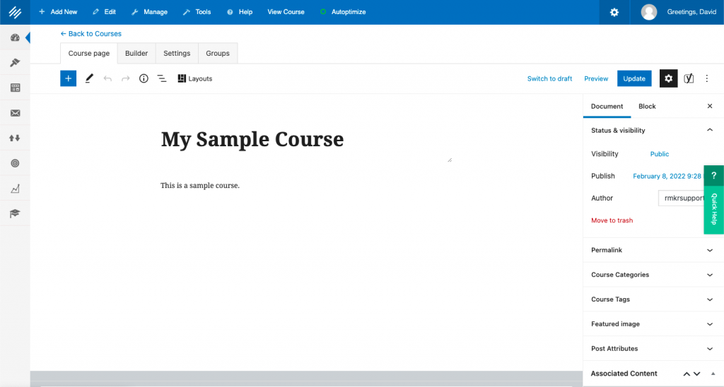 You can now add content to your course page. This is the first thing people will see when they open the course. You can use the same editor you’d use for your regular pages and posts.