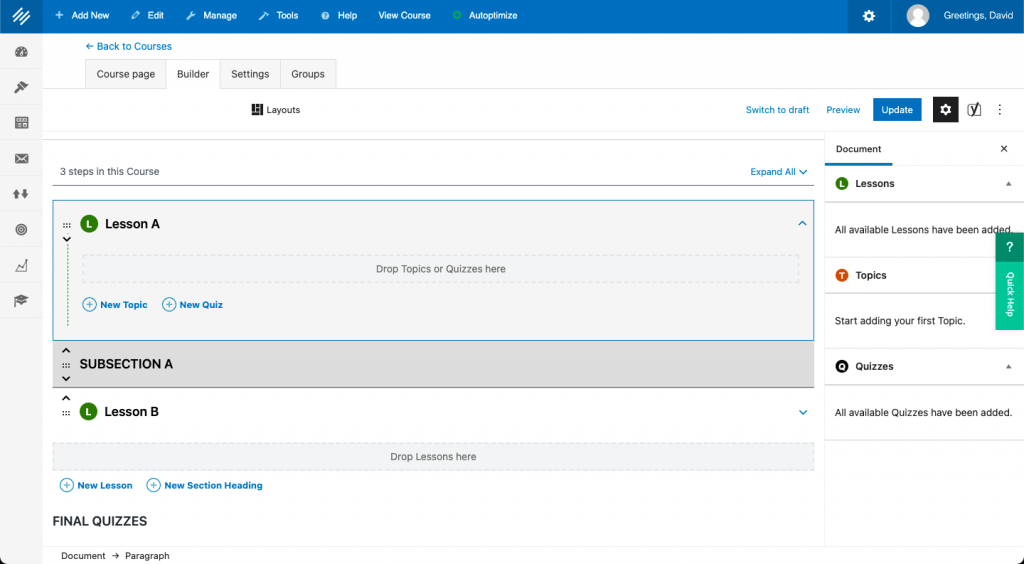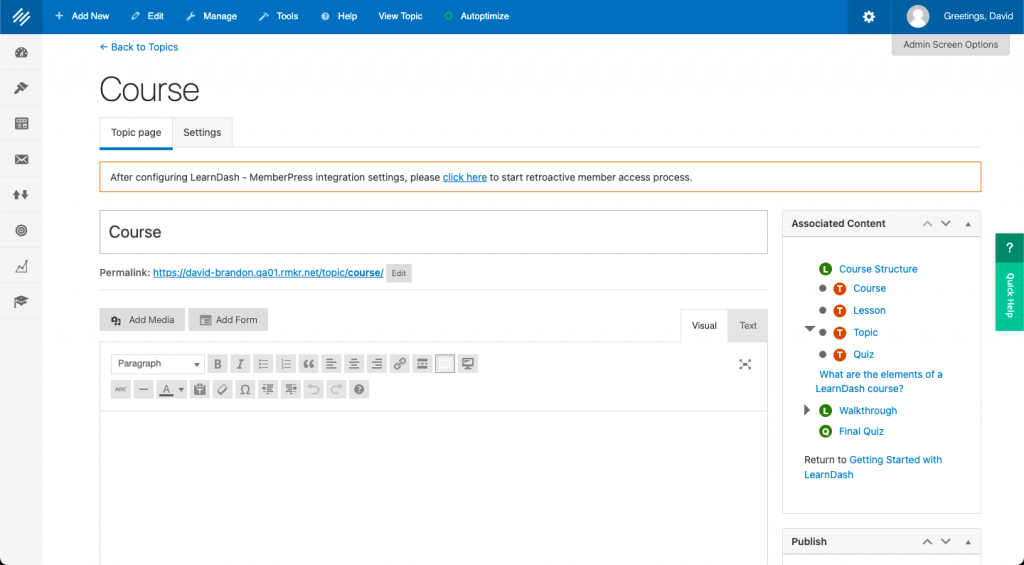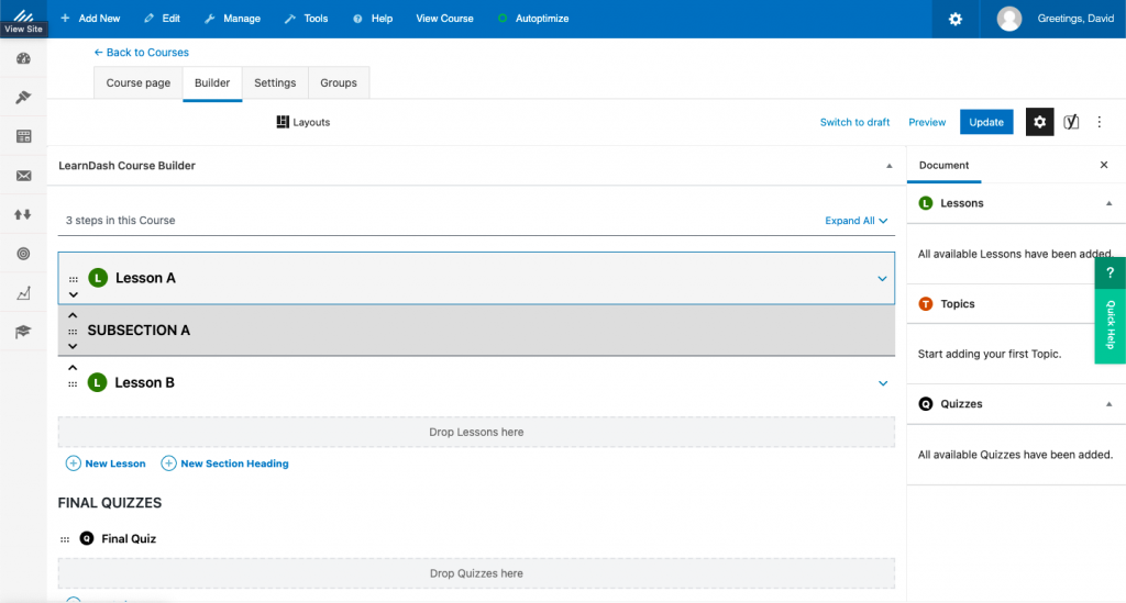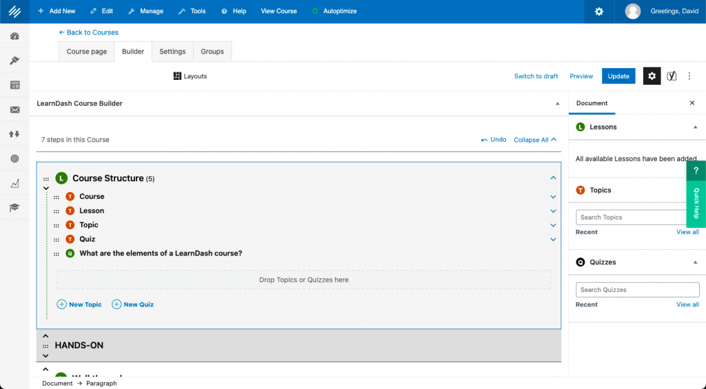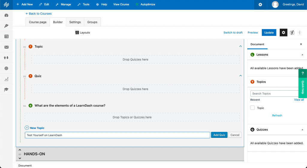 Most courses include some method for students to demonstrate learning. With LearnDash, you can add quizzes to topics, lessons and courses in exactly the same way you added a topic.