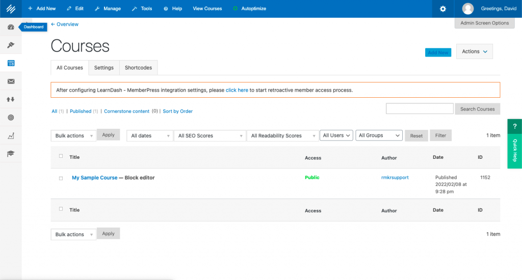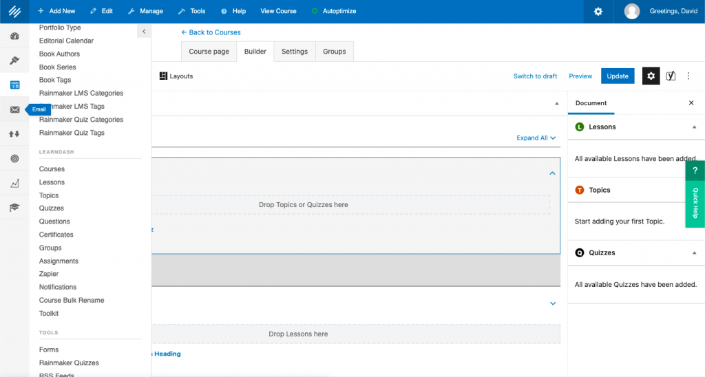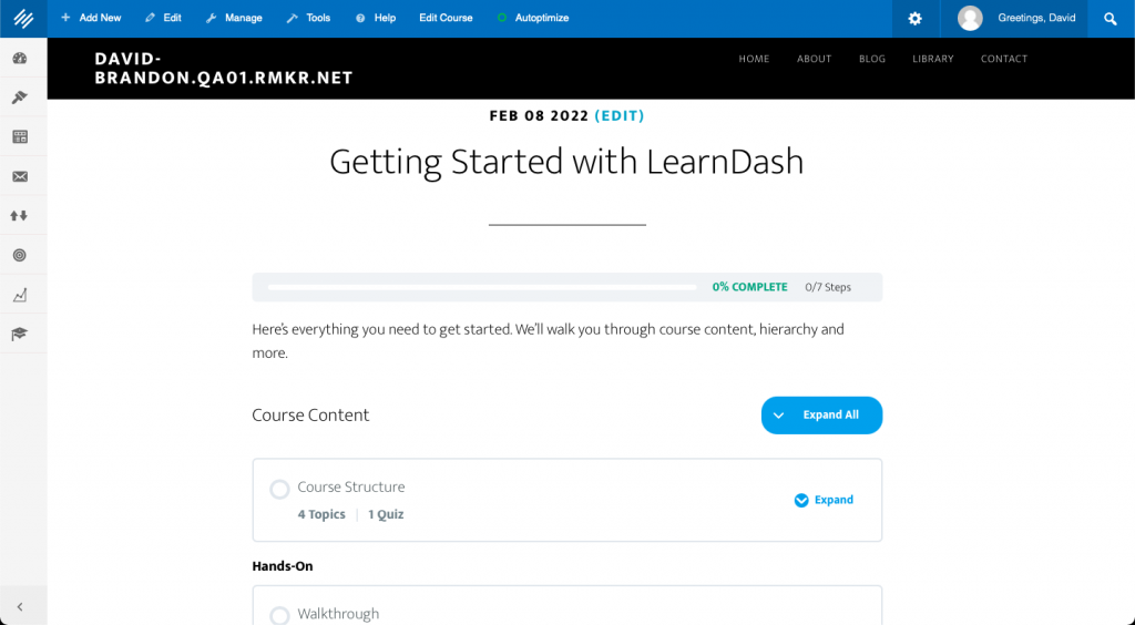 You’ll find LearnDash courses easy to build once you’ve done it a few times. Let’s walk through a sample course. This is an exercise you can try on your own Rainmaker Platform site.