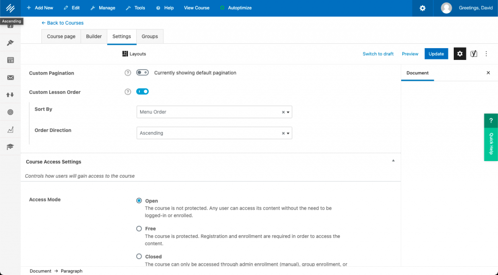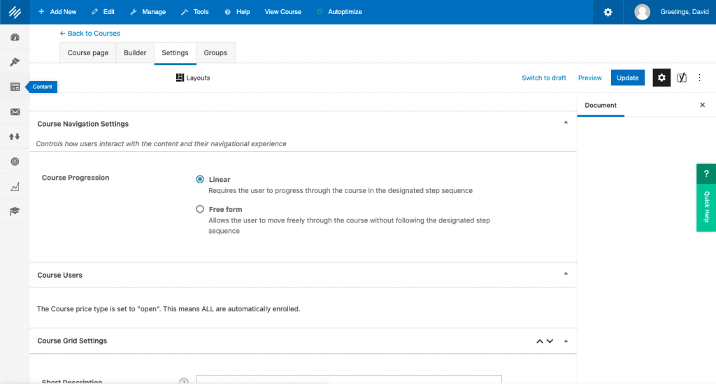 But before you do that, go to the Settings tab to make sure the course is marked “closed” while you add the course content. Click “Publish” or “Update” at the top right of the screen once you’ve completed this step.