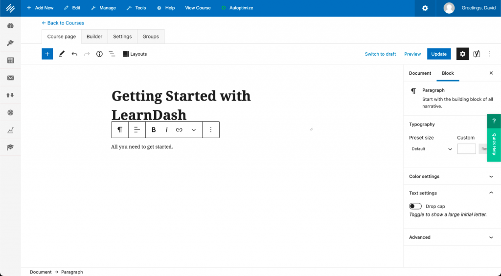 Courses don’t have to be math, science or a “school” subject. You can create a course on just about anything your audience is interested in. It could be the basics of the stock market, the digestive process or painting a wall. Whatever the subject, LearnDash can help you build a course that explains it clearly.