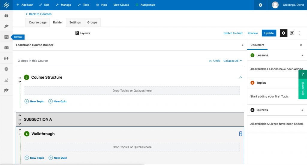 You also can add new topics and quizzes here or go to the left-hand menu under Content > LearnDash > Lesson > Add New.