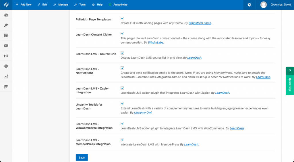 You’ll then want to click the “Add-Ons” tab to turn on a few other features. Make sure the check mark next to anything related to LearnDash is turned on — you may also want to turn on Fullwidth Page Templates. Click “Save” at the bottom of the page.