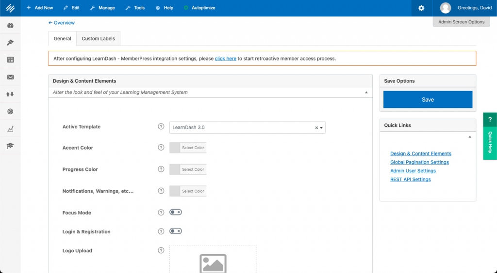 You’ll probably want to review your LearnDash settings as well. Mouse over the gear icon in the upper right hand corner of your screen and click “LearnDash” in the drop-down menu. You can edit your course appearance including design and color here.