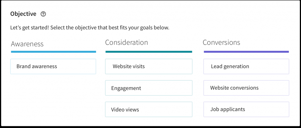 Effective LinkedIn advertising starts with selecting your objective. Objectives range from Awareness campaigns to specific goals like leads and job applicants.
