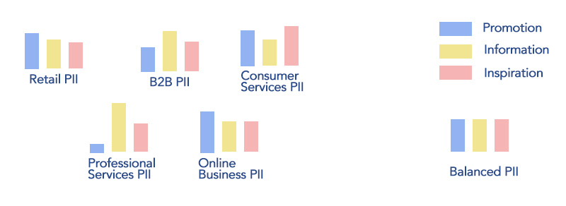 Each brand’s unique ratio of promotion, information, and inspiration messages is the key to establishing the authority, authenticity and personality of the brand. Every brand has its own PII™.