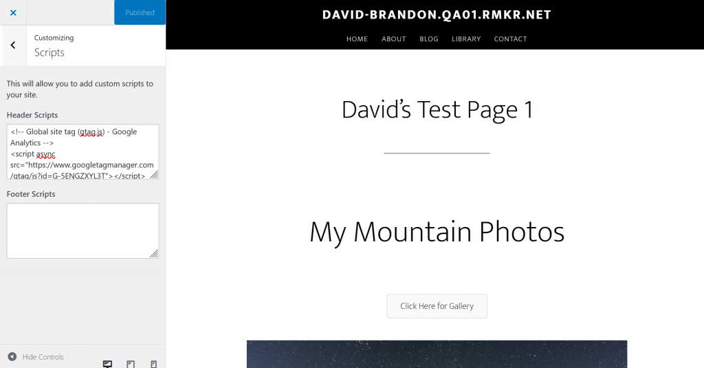 Add your Google tag in the “Header Scripts” field like in the example above. Publish your changes by clicking the blue “Publish” button.