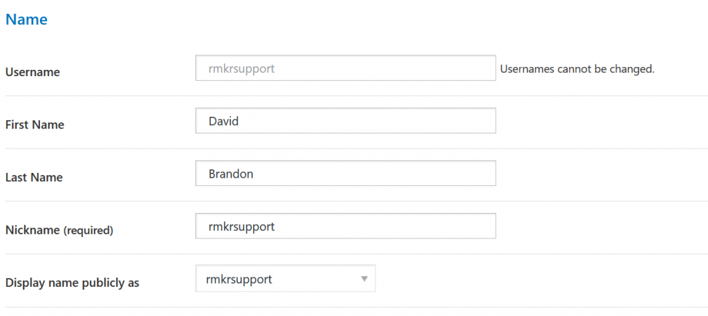 Here you’ll see all the names associated with the account. You can change the first and last name and the nickname, then choose what you want for the display name from the drop-down. The display name is the name that shows up in the author biography at the bottom of any post this author creates.