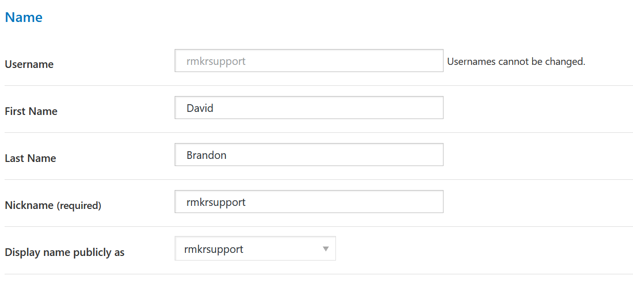 Here you’ll see all the names associated with the account. You can change the first and last name and the nickname, then choose what you want for the display name from the drop-down. The display name is the name that shows up in the author biography at the bottom of any post this author creates.