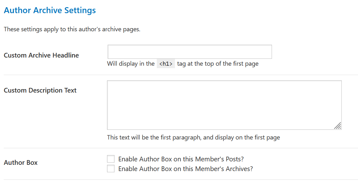 If you want a custom headline for the author page, you should add it in “Custom Archive Headline.” The same applies to the custom description text, which will display just after the headline.