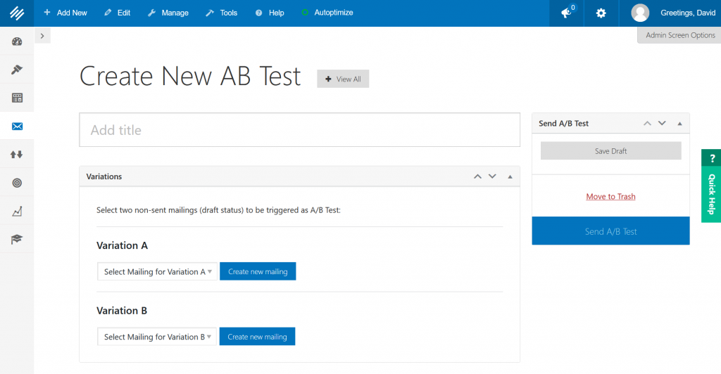 Create two identical emails, then personalize one version and leave the other generic. You can either do that from RainMail before setting up your A/B test or by clicking “Create New Mailing” from this screen. Set those emails as the A and B variants.